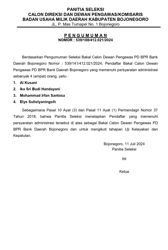 Pengumuman Seleksi Bakal Calon Dewan Pengawas PD BPR Bank Daerah Bojonegoro
