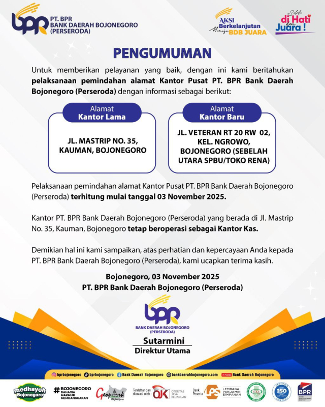 Pemindahan Alamat Kantor Pusat PT BPR Bank Daerah Bojonegoro (Perseroda)
