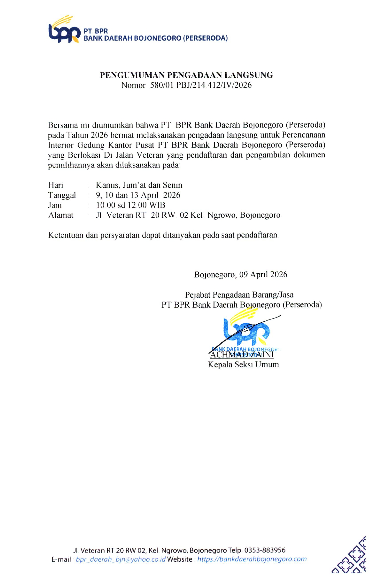 Halaman Pengumuman berisi informasi resmi dan terkini yang disampaikan oleh PT BPR Bank Daerah Bojonegoro ( Perseroda ) kepada masyarakat, nasabah, maupun pihak terkait. Setiap pengumuman disajikan secara jelas dan informatif, mencakup pemberitahuan penting, jadwal kegiatan, perubahan layanan, kebijakan perusahaan, serta informasi lainnya yang perlu diketahui.
